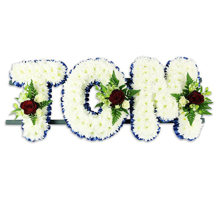 Designed to spell out "TOM", this tribute offers a dignified and personal way to express your deepest sympathy and pay your respects. The fresh, premium blooms are arranged by skilled local florists to ensure balance, beauty and longevity, making it a fitting focal piece for a funeral, memorial or celebration of life service.