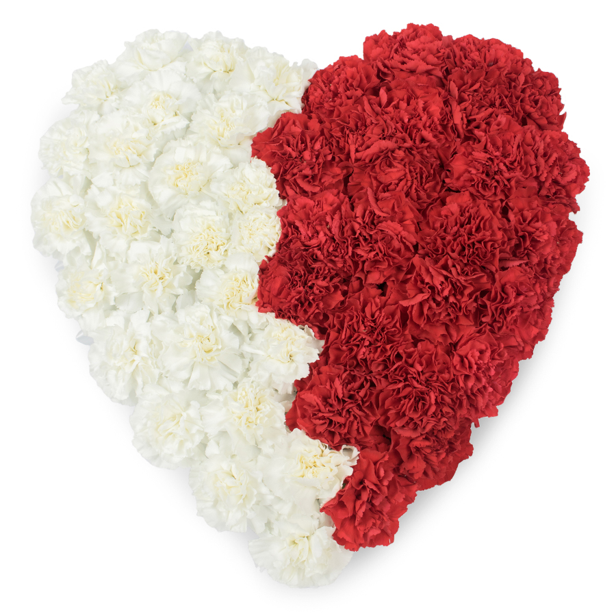 Introducing our Elegant Heart-Shaped Mixed Carnations, a sophisticated bouquet by Handy Flowers. This beautiful arrangement features a mix of white and red carnations, perfect for expressing sympathy and heartfelt sentiments.